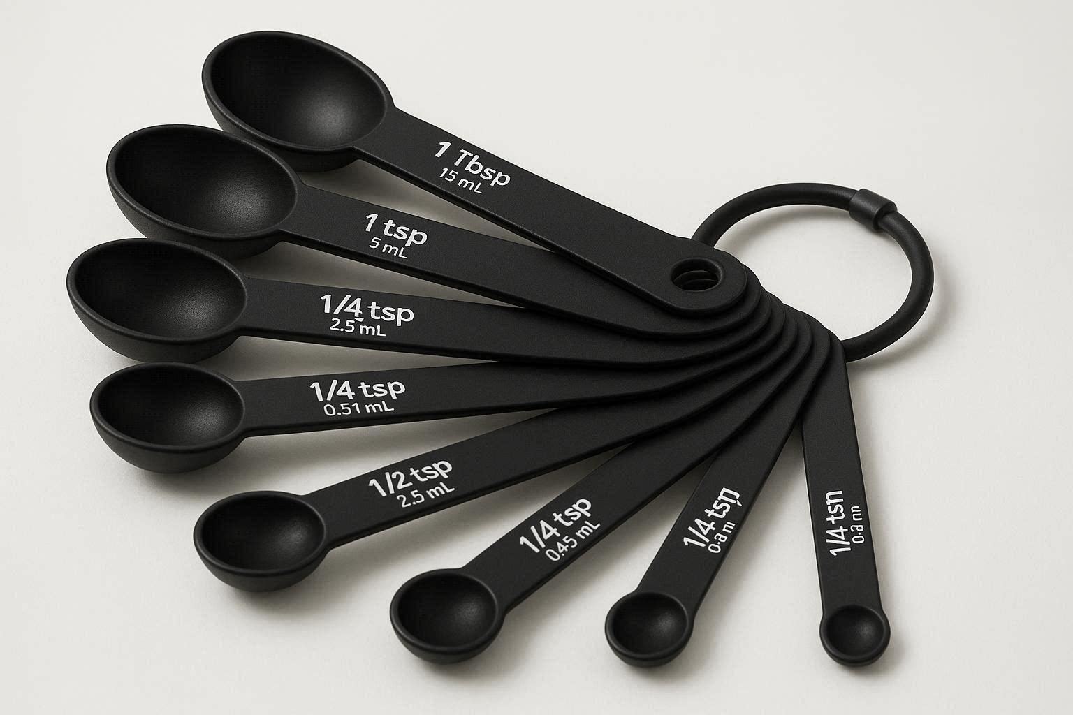 This 7 piece stackable measuring spoon set includes measurements of 1/8 tsp, 1/4 tsp, 1/2 tsp, 1 tsp, 1/2 tbsp, 1 tbsp and 2 tbsp, in both metric and imperial units. The spoons are made from food grade stainless steel, with a polished finish that is easy to clean and resistant to rust and corrosion. Each spoon has clear, engraved markings that won??t fade, ensuring accurate measurements every time.